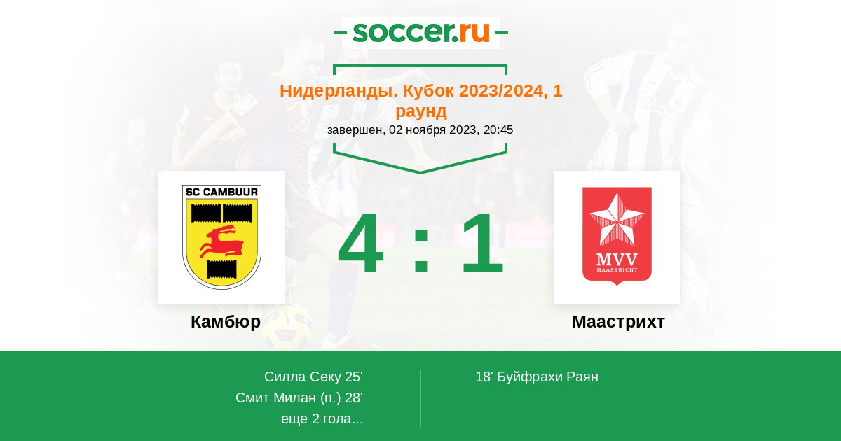 Нидерланды. Первый дивизион 12.01.2024 Камбюр Логотип футбольный клуб Камбюр (Лиуварден) 5:2 Логотип футбольный клуб Маастрихт Маастрихт