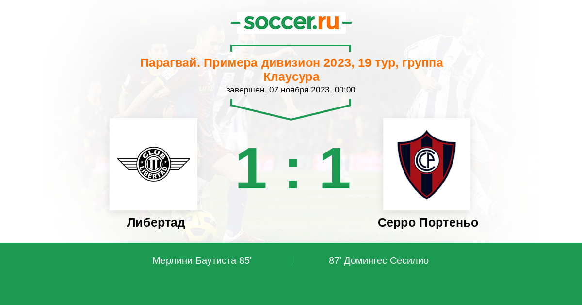 Парагвай. Примера дивизион 24.11.2025 Серро Портеньо Логотип футбольный клуб Серро Портеньо (Асунсьон) 1:0 Логотип футбольный клуб Либертад (Асунсьон) Либертад