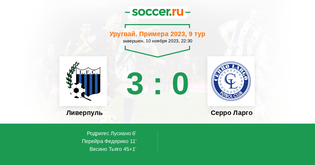 Уругвай. Примера A 17.06.2023 Серро Ларго Логотип футбольный клуб Серро Ларго (Мело) 1:3 Логотип футбольный клуб Ливерпуль (Монтевидео) Ливерпуль