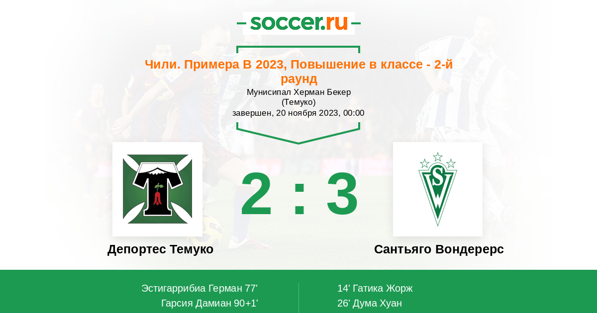 Чили. Примера В 25.03.2024 Сантьяго Вондерерс Логотип футбольный клуб Сантьяго Вондерерс 2:1 Логотип футбольный клуб Депортес Темуко Депортес Темуко