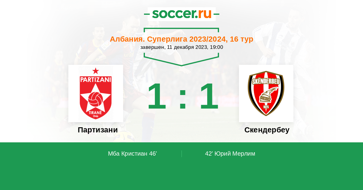 Албания. Суперлига 11.01.2025 Партизани Логотип футбольный клуб Партизани (Тирана) 1:1 Логотип футбольный клуб Скендербеу (Корча) Скендербеу