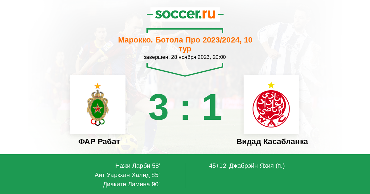 Марокко. Ботола Про 13.04.2024 Видад Касабланка Логотип футбольный клуб Видад Касабланка 0:1 Логотип футбольный клуб ФАР Рабат ФАР Рабат