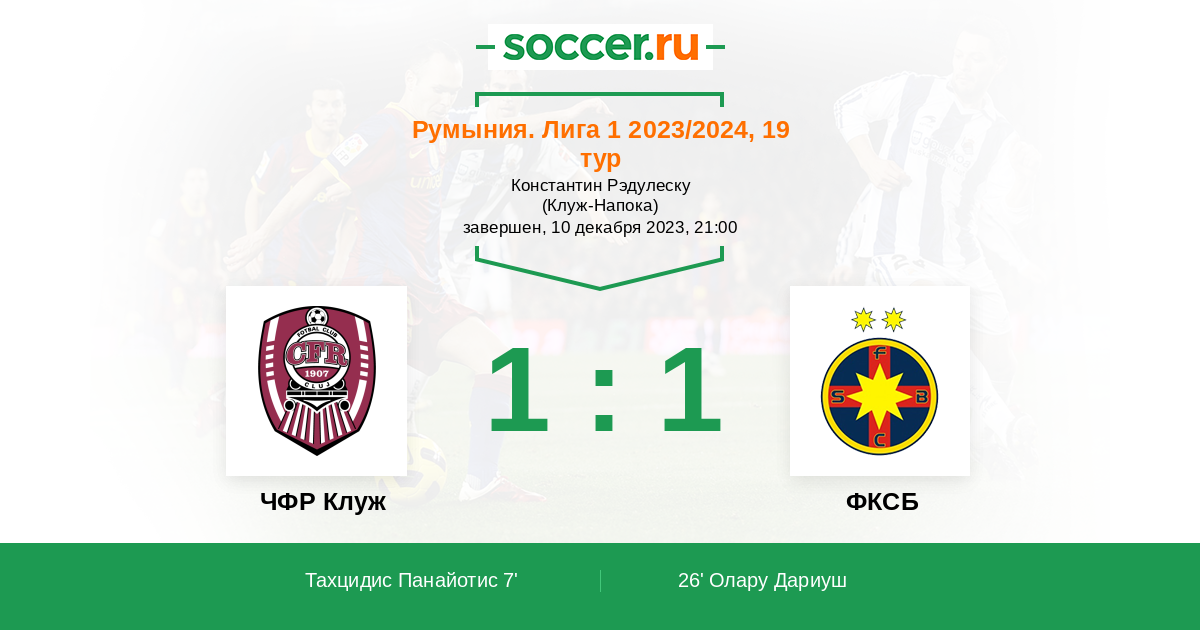 Румыния. Лига 1 06.08.2023 ФКСБ Логотип футбольный клуб ФКСБ (Бухарест) 1:0 Логотип футбольный клуб ЧФР Клуж (Бухарест) ЧФР Клуж