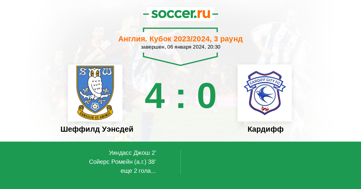Англия. Чемпионшип 23.12.2023 Шеффилд Уэнсдей Логотип футбольный клуб Шеффилд Уэнсдей 1:2 Логотип футбольный клуб Кардифф Кардифф
