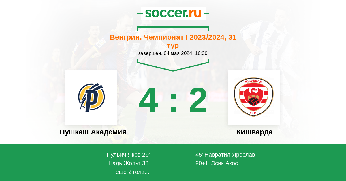 Венгрия. Чемпионат 1 06.04.2019 Пушкаш Академия Логотип футбольный клуб Пушкаш Академия (Фелксут) 0:4 Логотип футбольный клуб Кишварда Кишварда