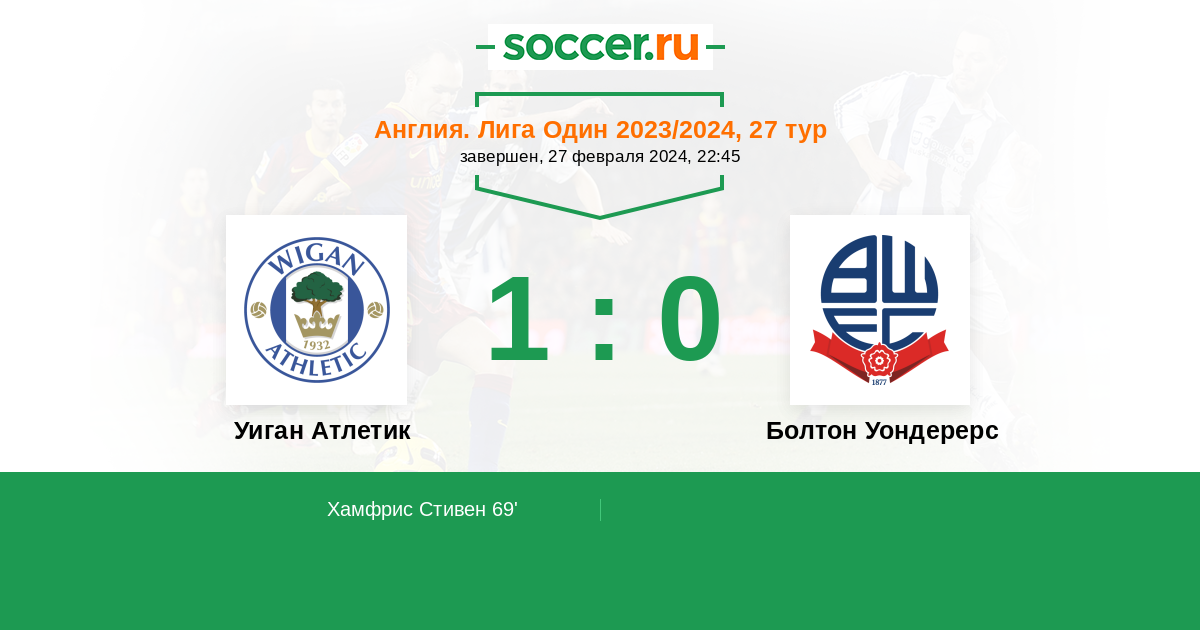 Англия. Первая Футбольная Лига 17.01.2026 Уиган Атлетик Логотип футбольный клуб Уиган Атлетик 0:1 Логотип футбольный клуб Болтон Уондерерс Болтон Уондерерс