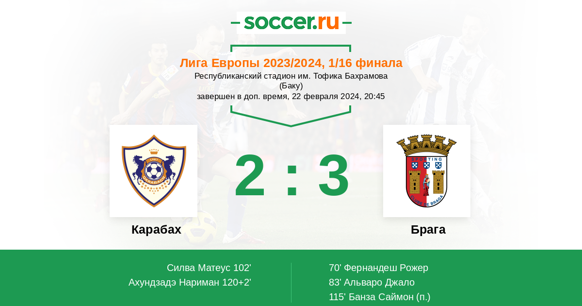 В первом матче в Португалии команды устроили праздник атакующего футбола и на двоих настреляли аж шесть голов. В итоге, на удивление многих, Карабах вышел победителем дуэли с хоккейным счётом 4-2. Возможно, в ответной встрече так много голов ждать не стоит, ведь хозяевам для прохождения дальше по турниру нужно всего лишь удержать имеющееся преимущество. Но как минимум по одному точному удару с каждой стороны я лично жду. Оборона - далеко не самая сильная сторона ни у "скакунов", ни у "оружейников". А вот забивать умеют и те, и другие. Браге после домашнего поражения нет смысла отсиживаться в обороне, да и не умеет она это делать. Рано или поздно гости начнут атаковать большими силами и раскрываться. Что только на руку хозяевам, которые любят играть на контратаках.