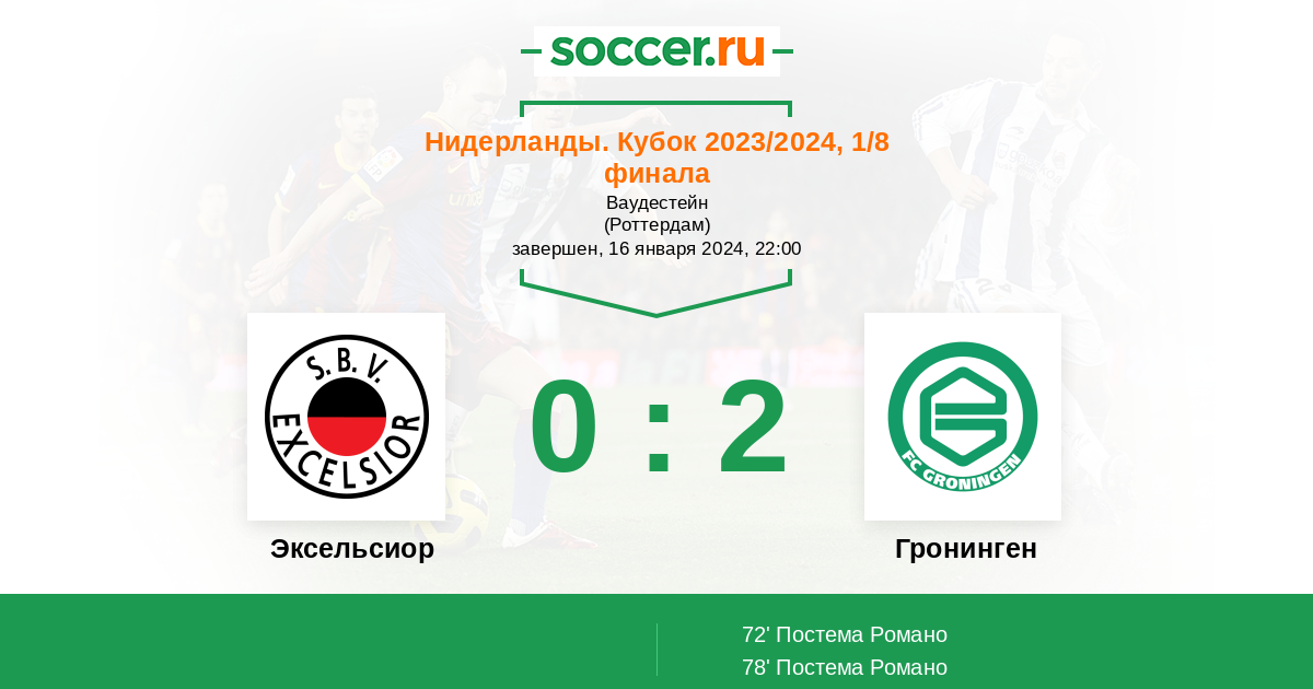 Нидерланды. Кубок 15.12.2021 Эксельсиор Логотип футбольный клуб Эксельсиор (Роттердам) 2:4 Логотип футбольный клуб Гронинген Гронинген