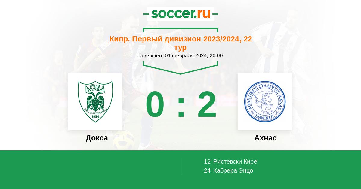 Кипр. Первый Дивизион 23.01.2017 Ахнас Логотип футбольный клуб Ахнас 2:0 Логотип футбольный клуб Докса (Катокопиас) Докса