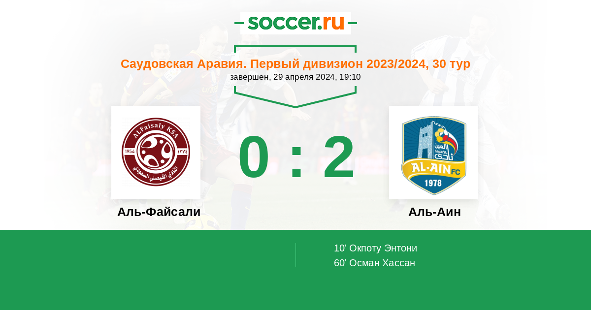 В предстоящем матче 30 - го тура Первого Дивизиона Саудовской Аравии между командами Аль-Файсали и Аль-Айн , моим фаворитом на победу является команда хозяев Аль-Файсали , так как они играют дома.