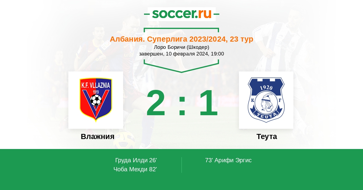 Албания. Суперлига 13.02.2022 Влажния Логотип футбольный клуб Влажния (Шкодер) 4:2 Логотип футбольный клуб Теута (Дуррес) Теута