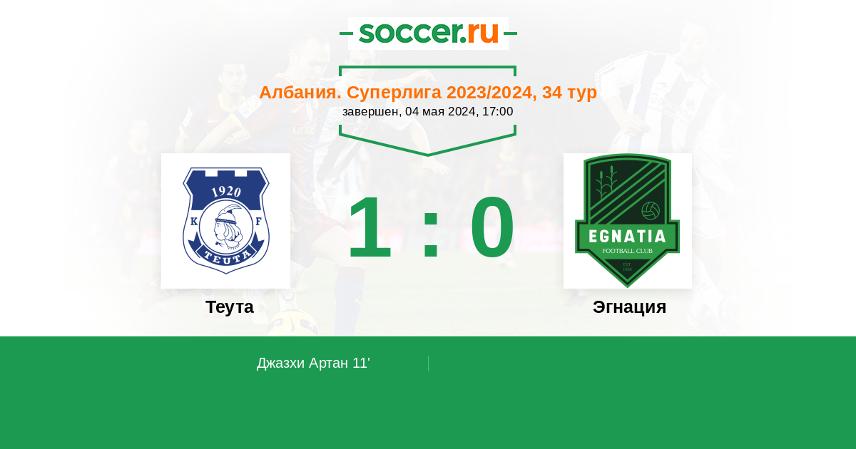 Албания. Суперлига 22.01.2023 Теута Логотип футбольный клуб Теута (Дуррес) 1:1 Логотип футбольный клуб Эгнация (Рогожина) Эгнация