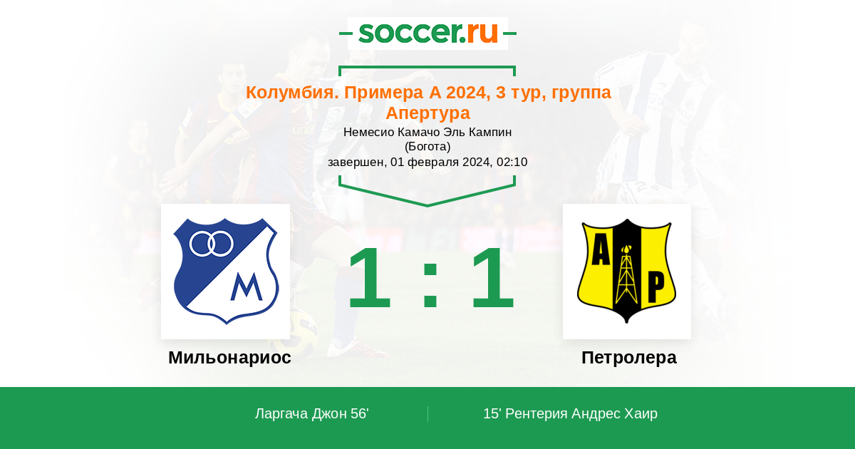 Колумбия. Примера А 30.07.2023 Петролера Логотип футбольный клуб Петролера 1:0 Логотип футбольный клуб Мильонариос (Богота) Мильонариос