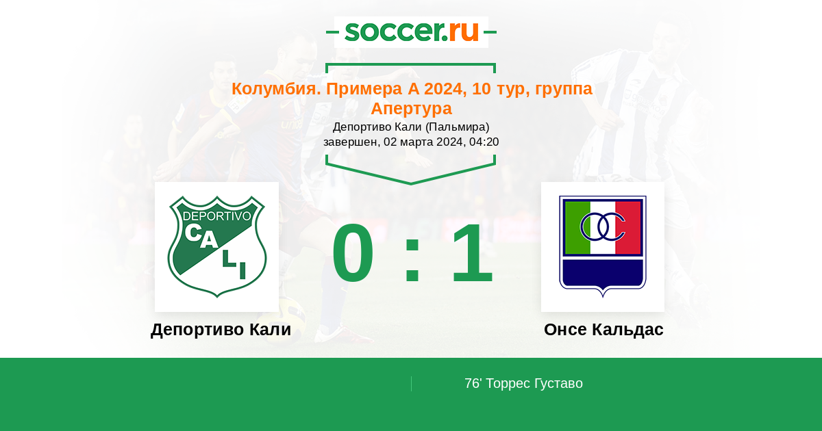 Колумбия. Примера А 12.02.2011 Онсе Кальдас Логотип футбольный клуб Онсе Кальдас (Манисалес) 2:0 Логотип футбольный клуб Депортиво Кали Депортиво Кали