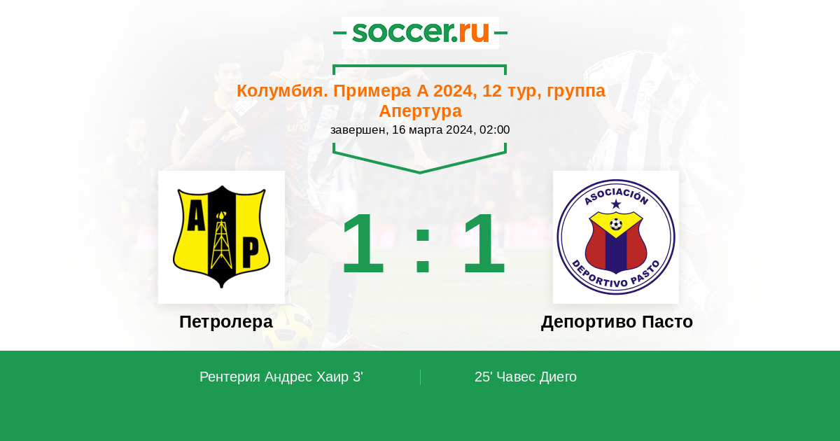 Колумбия. Примера А 16.04.2025 Петролера Логотип футбольный клуб Петролера 1:0 Логотип футбольный клуб Депортиво Пасто Депортиво Пасто