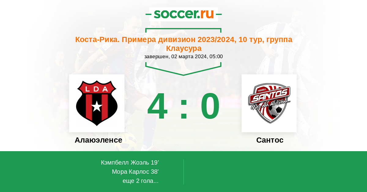 Коста-Рика. Примера дивизион 08.04.2012 Алаюэленсе Логотип футбольный клуб Алаюэленсе (Алаюэла) 2:0 Логотип футбольный клуб Сантос (Гуапилес) Сантос