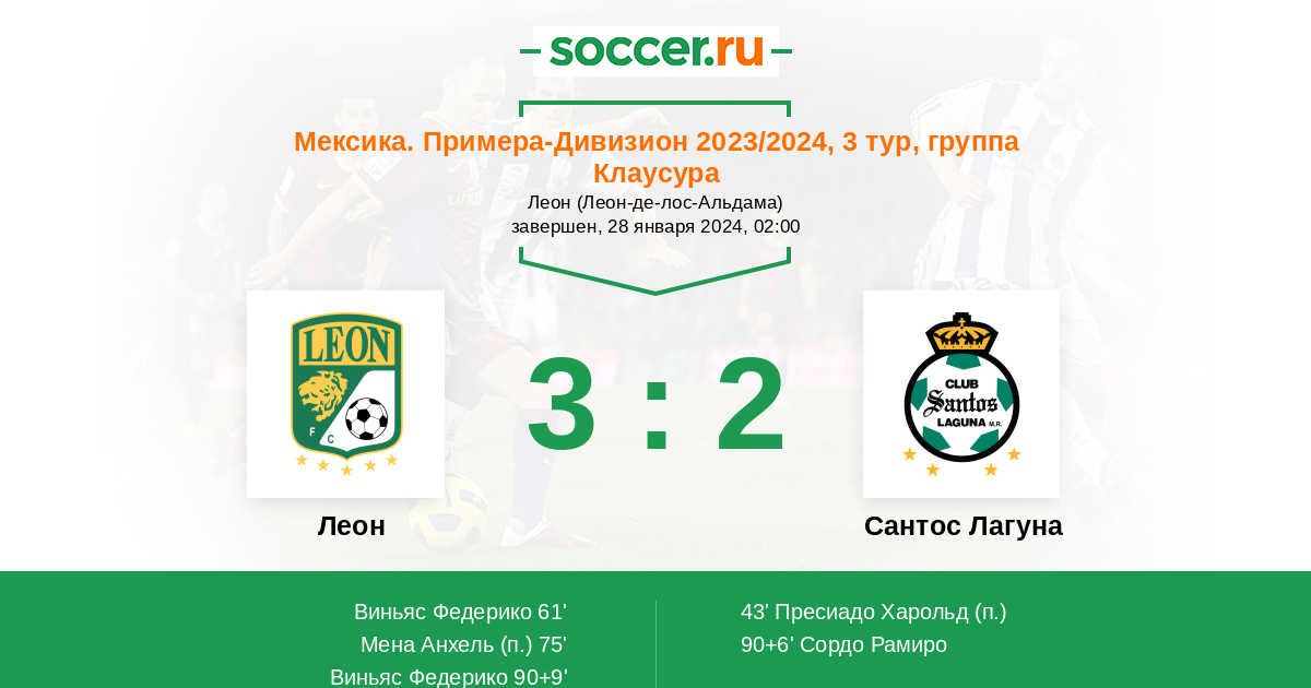 Мексика. Примера-Дивизион 03.03.2019 Леон Логотип футбольный клуб Леон 3:0 Логотип футбольный клуб Сантос Лагуна (Торреон) Сантос Лагуна
