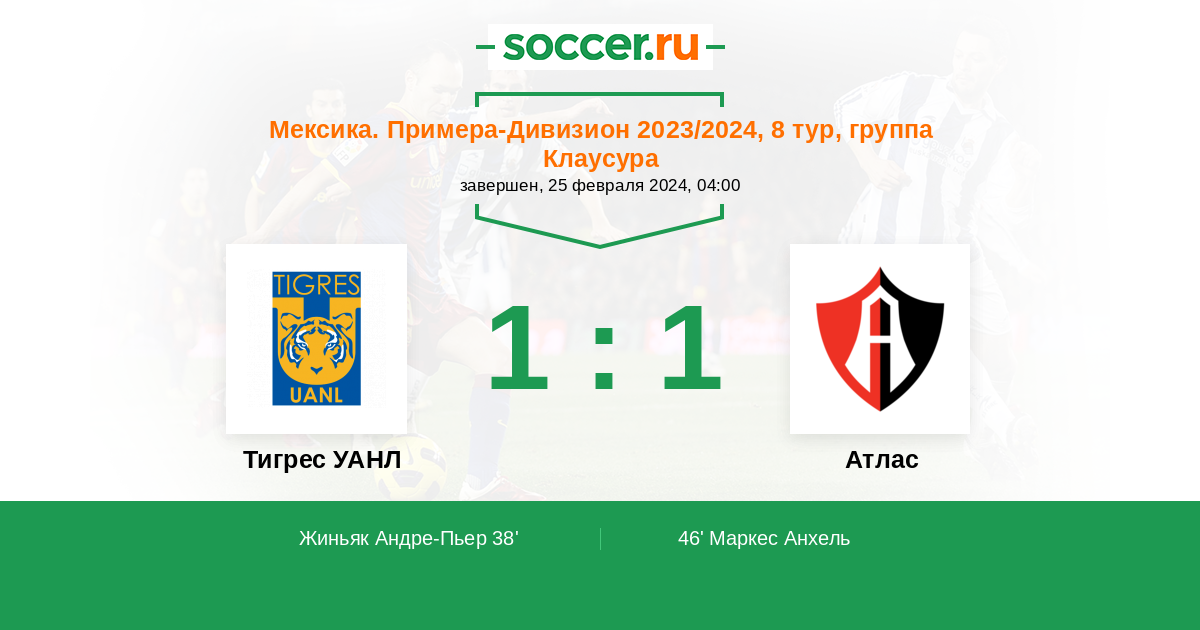 Мексика. Примера-Дивизион 13.07.2024 Атлас Логотип футбольный клуб Атлас (Гвадалахара) 1:1 Логотип футбольный клуб Тигрес УАНЛ (Монтеррей) Тигрес УАНЛ