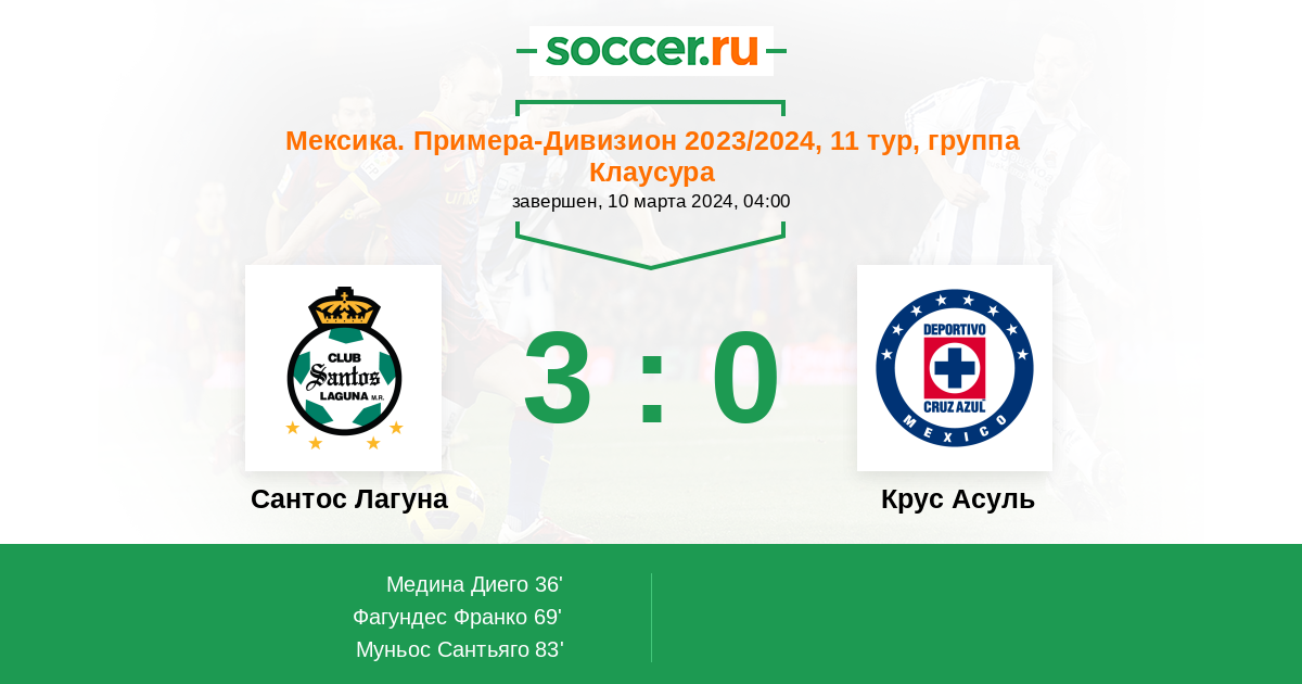 Мексика. Примера-Дивизион 03.11.2024 Крус Асуль Логотип футбольный клуб Крус Асуль (Мехико) 2:0 Логотип футбольный клуб Сантос Лагуна (Торреон) Сантос Лагуна