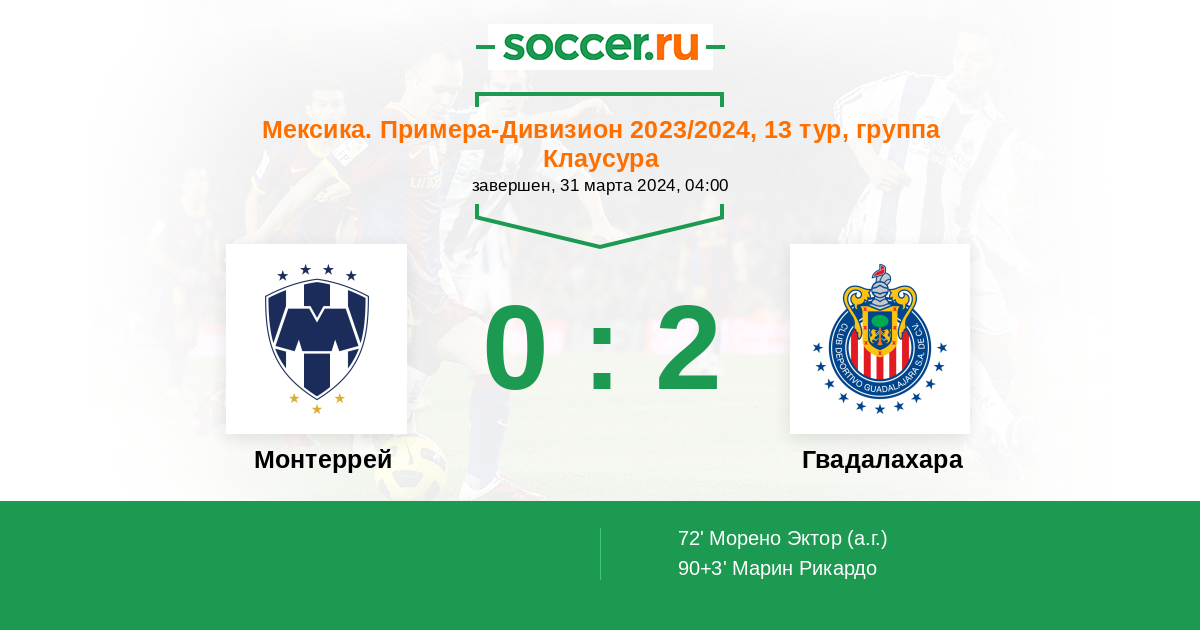 Мексика. Примера-Дивизион 06.04.2025 Монтеррей Логотип футбольный клуб Монтеррей 3:1 Логотип футбольный клуб Гвадалахара Гвадалахара