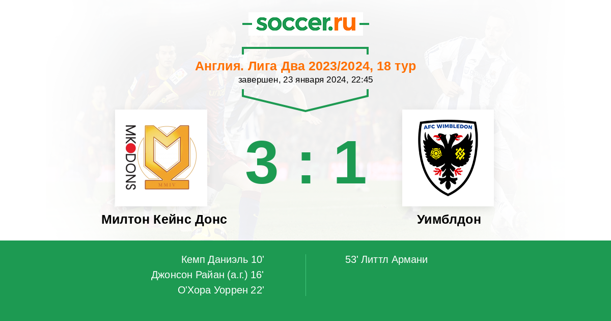 Англия. Вторая Футбольная Лига 02.03.2024 Уимблдон Логотип футбольный клуб Уимблдон (Лондон) 1:0 Логотип футбольный клуб Милтон Кейнс Донс Милтон Кейнс Донс