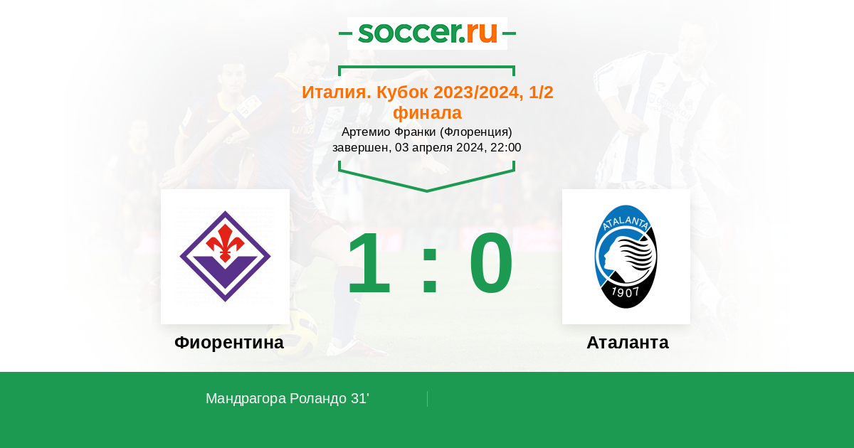 Италия. Кубок 24.04.2024 Аталанта Логотип футбольный клуб Аталанта (Бергамо) 4:1 Логотип футбольный клуб Фиорентина (Флоренция) Фиорентина