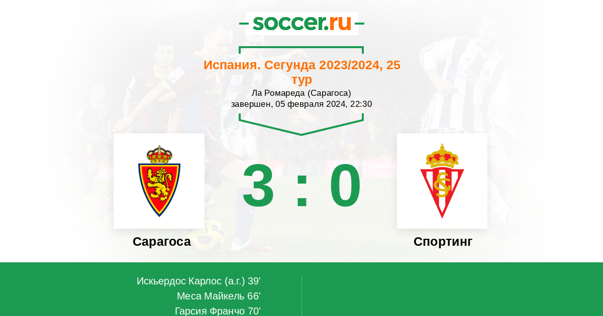 Испания. Сегунда 27.02.2022 Спортинг Логотип футбольный клуб Спортинг (Хихон) 1:2 Логотип футбольный клуб Сарагоса Сарагоса