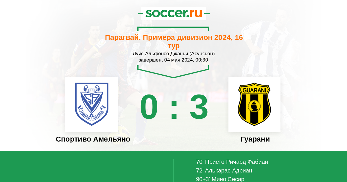 Парагвай. Примера дивизион 17.04.2023 Спортиво Амельяно Логотип футбольный клуб Спортиво Амельяно (Асунсьон) 1:1 Логотип футбольный клуб Гуарани (Асунсьон) Гуарани