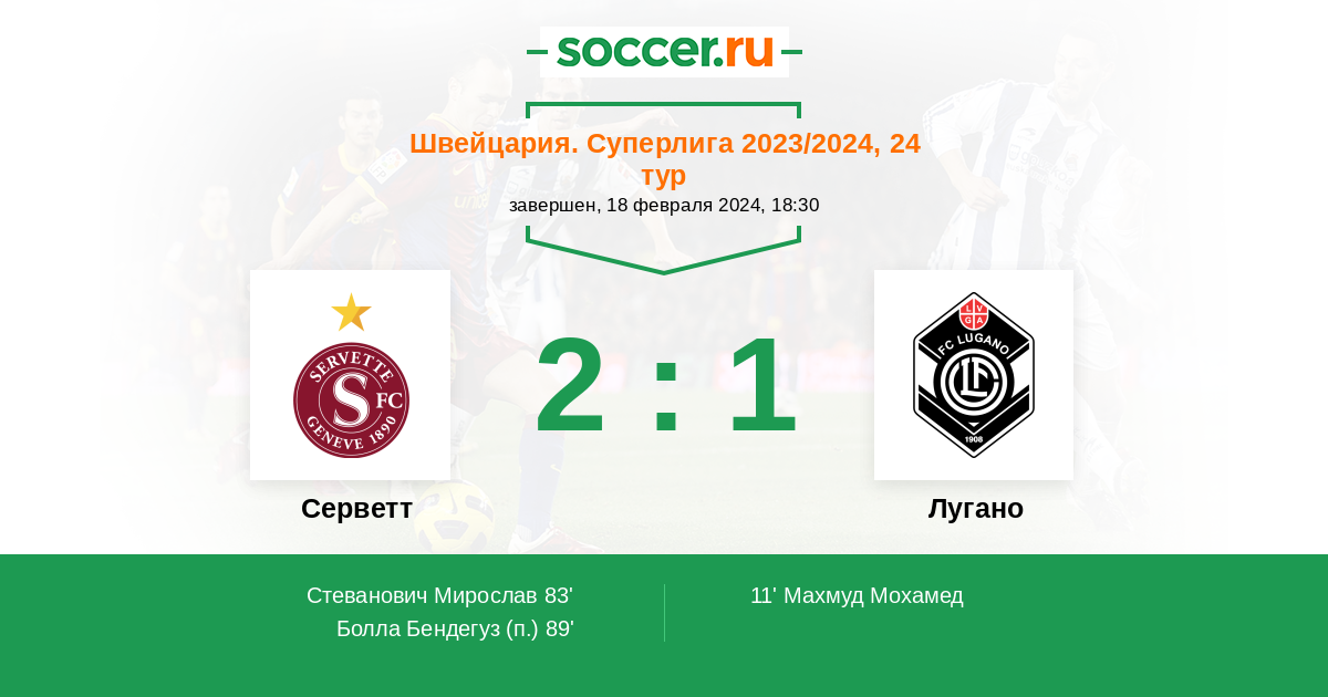 Швейцария. Суперлига 26.02.2022 Лугано Логотип футбольный клуб Лугано 2:0 Логотип футбольный клуб Серветт (Женева) Серветт