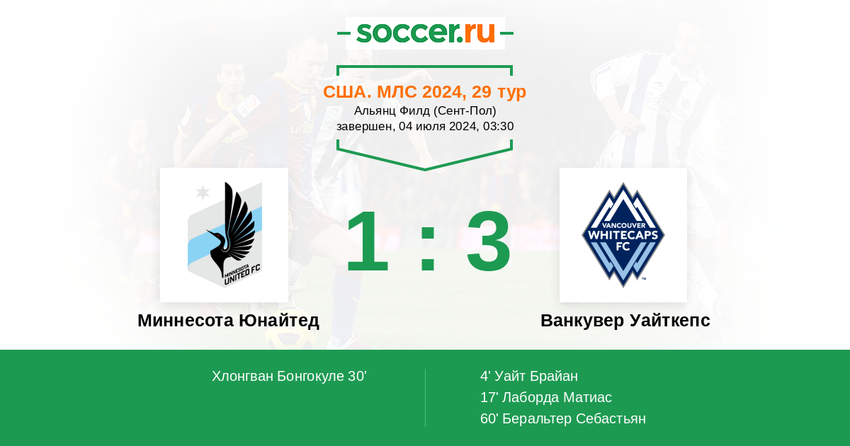 США. МЛС 27.04.2025 Миннесота Юнайтед Логотип футбольный клуб Миннесота Юнайтед 1:3 Логотип футбольный клуб Ванкувер Уайткепс Ванкувер Уайткепс