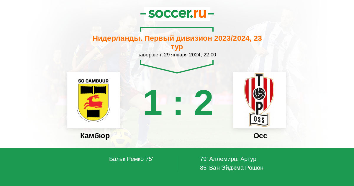 Нидерланды. Первый дивизион 26.11.2012 Осс Логотип футбольный клуб Осс 1:3 Логотип футбольный клуб Камбюр (Лиуварден) Камбюр