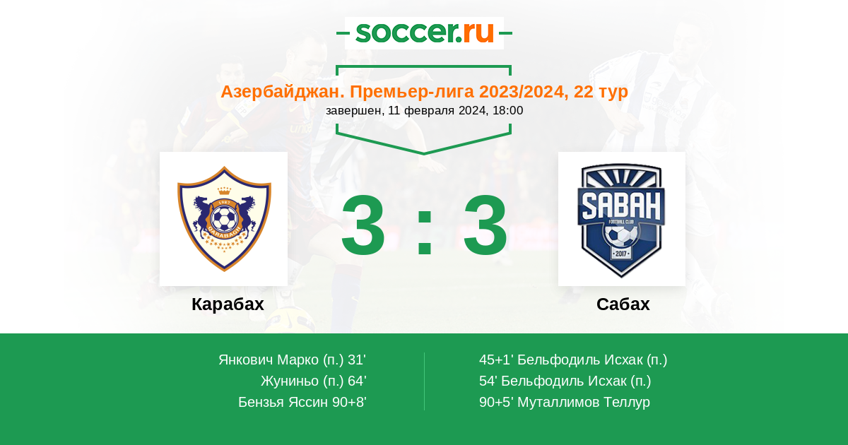 Азербайджан. Премьер-Лига 14.04.2024 Сабах Логотип футбольный клуб Сабах (Баку) 3:2 Логотип футбольный клуб Карабах (Агдам) Карабах