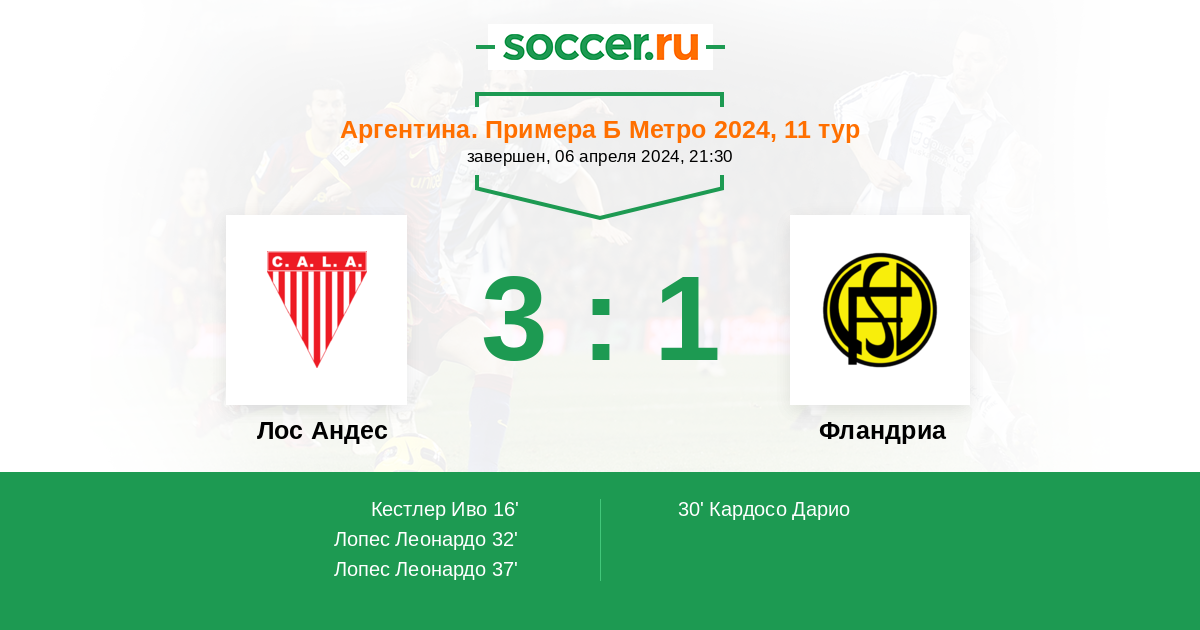 Аргентина. Примера Б Метро 10.04.2011 Фландриа Логотип футбольный клуб Фландриа (Лухан) 1:2 Логотип футбольный клуб Лос Андес (Ломас-де-Самора) Лос Андес