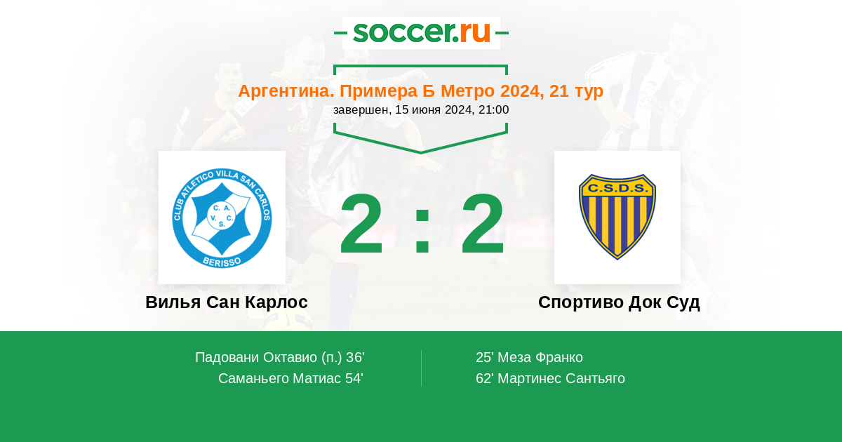 Аргентина. Примера Б Метро 04.10.2025 Вилья Сан Карлос Логотип футбольный клуб Вилья Сан Карлос (Берисо) 2:2 Логотип футбольный клуб Спортиво Док Суд (Буэнос-Айрес) Спортиво Док Суд