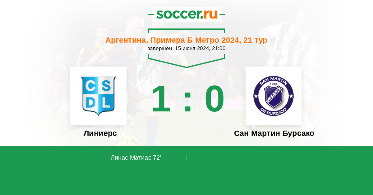 Аргентина. Примера Б Метро 02.11.2024 Сан Мартин Бурсако Логотип футбольный клуб Сан Мартин Бурсако 0:1 Логотип футбольный клуб Линиерс (Ла-Матанса) Линиерс