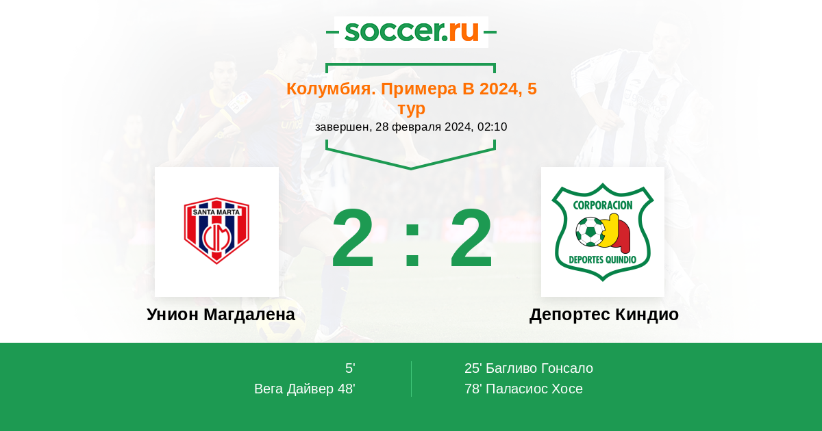 Колумбия. Примера B 15.12.2020 Депортес Киндио Логотип футбольный клуб Депортес Киндио (Армения) 2:2 Логотип футбольный клуб Унион Магдалена (Санта Марта) Унион Магдалена