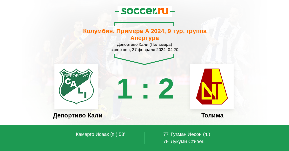 Колумбия. Примера А 27.02.2023 Толима Логотип футбольный клуб Толима (Ибаге) 1:2 Логотип футбольный клуб Депортиво Кали Депортиво Кали