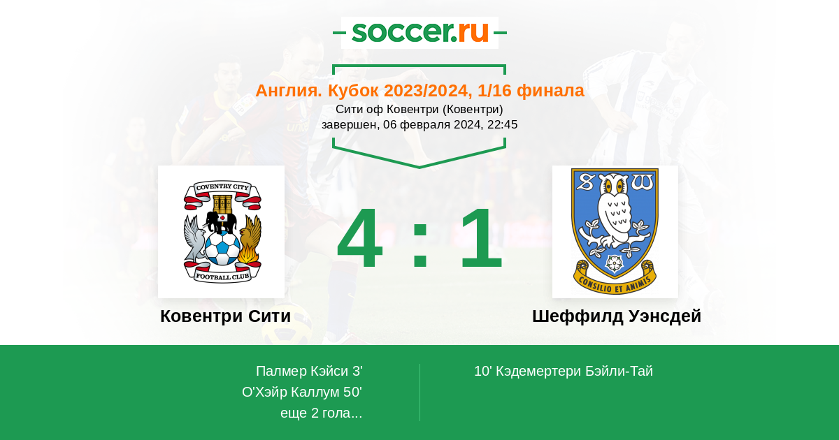Англия. Кубок 26.01.2024 Шеффилд Уэнсдей Логотип футбольный клуб Шеффилд Уэнсдей 1:1 Логотип футбольный клуб Ковентри Сити Ковентри Сити