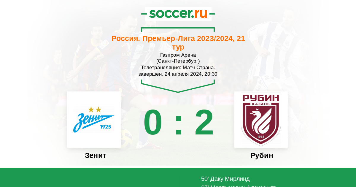 Россия. Премьер-Лига 06.04.2014 Зенит Логотип футбольный клуб Зенит (Санкт-Петербург) 6:2 Логотип футбольный клуб Рубин (Казань) Рубин