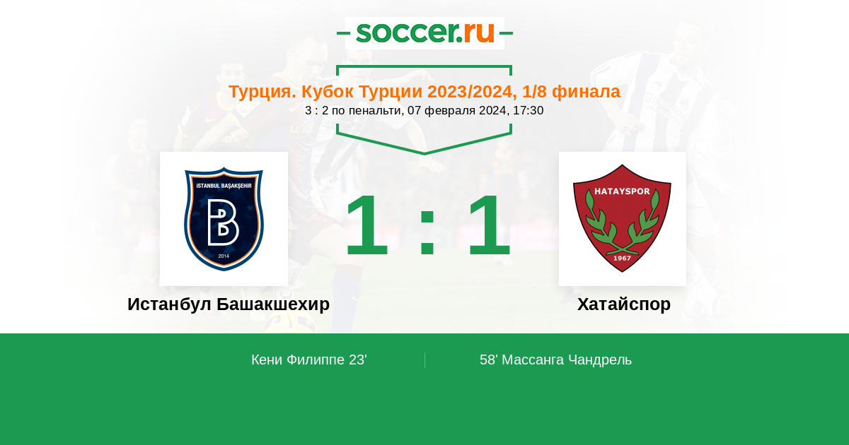 Турция. Суперлига 07.11.2022 Хатайспор Логотип футбольный клуб Хатайспор 3:3 Логотип футбольный клуб Истанбул Башакшехир (Стамбул) Истанбул Башакшехир