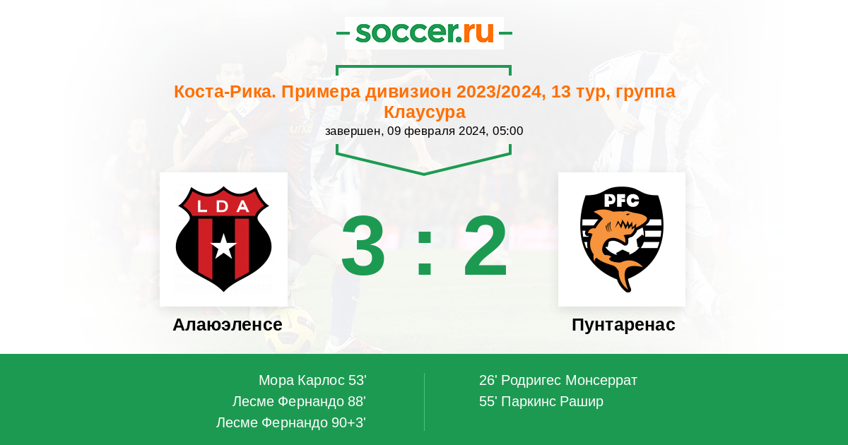 Коста-Рика. Примера дивизион 23.11.2023 Пунтаренас Логотип футбольный клуб Пунтаренас 1:2 Логотип футбольный клуб Алаюэленсе (Алаюэла) Алаюэленсе