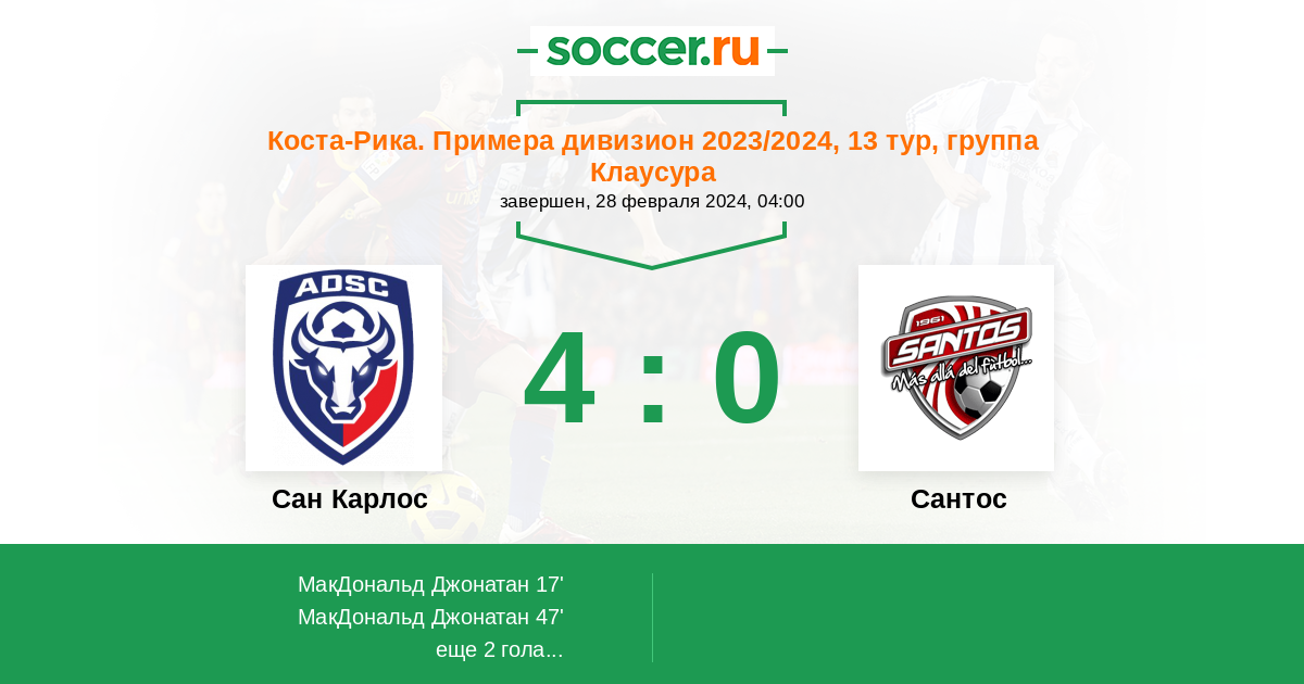 Коста-Рика. Примера дивизион 17.01.2024 Сантос Логотип футбольный клуб Сантос (Гуапилес) 2:4 Логотип футбольный клуб Сан Карлос (Сьюдад Куэсада) Сан Карлос