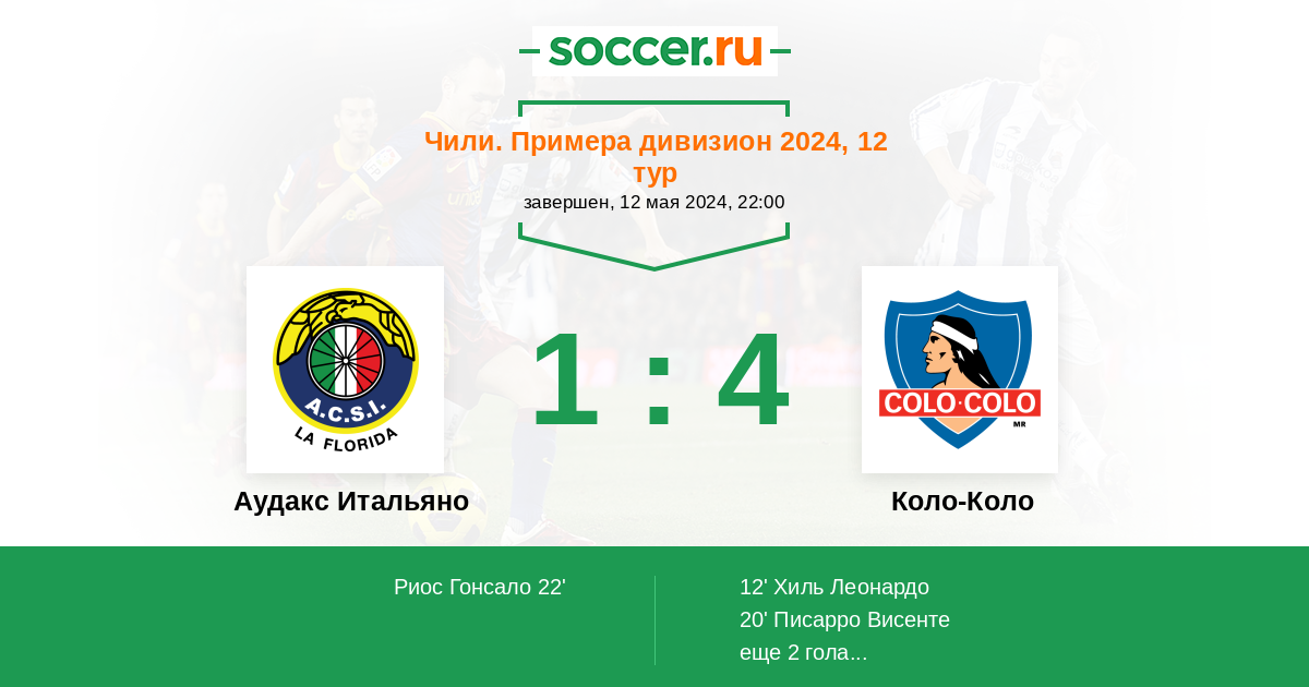 Чили. Примера дивизион 10.05.2023 Коло-Коло Логотип футбольный клуб Коло-Коло (Сантьяго) 2:1 Логотип футбольный клуб Аудакс Итальяно (Сантьяго) Аудакс Итальяно
