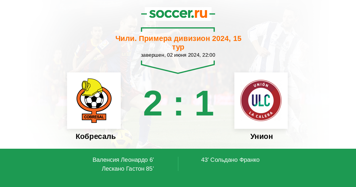 Чили. Примера дивизион 05.06.2021 Кобресаль Логотип футбольный клуб Кобресаль (Эль-Сальвадор) 0:1 Логотип футбольный клуб Унион (Ла Калера) Унион