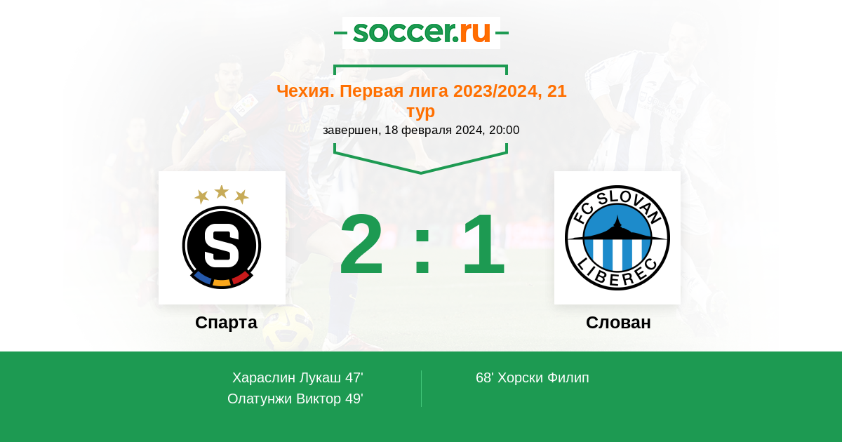 Чехия. Первая Лига 19.10.2024 Спарта Логотип футбольный клуб Спарта (Прага) 2:1 Логотип футбольный клуб Слован (Либерец) Слован