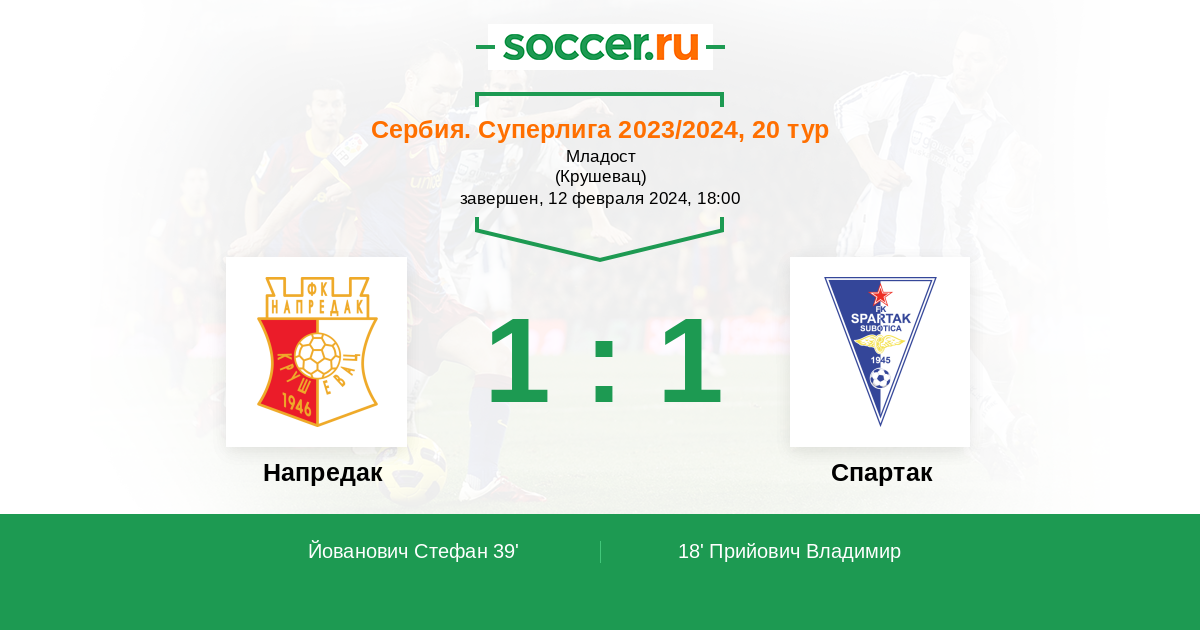 Сербия. Суперлига 05.03.2023 Напредак Логотип футбольный клуб Напредак (Крушевац) 1:1 Логотип футбольный клуб Спартак Суботица Спартак Суботица