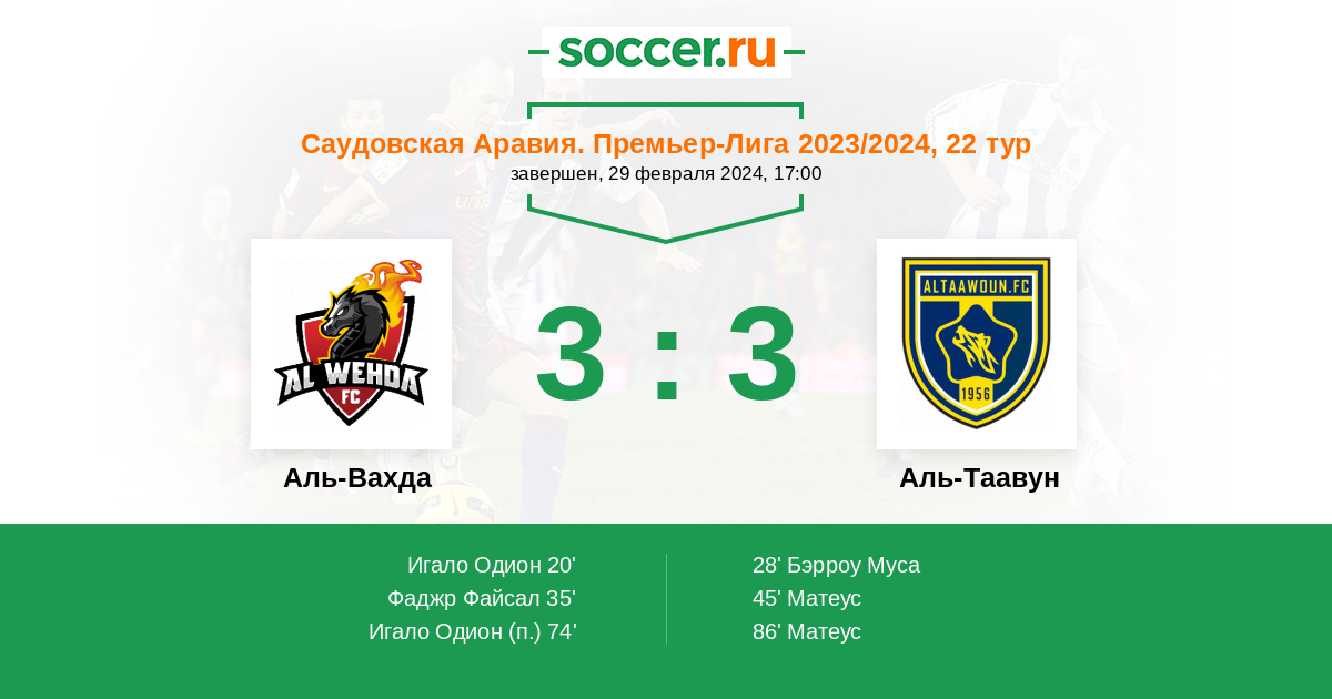 Саудовская Аравия. Премьер-Лига 17.03.2023 Аль-Вахда Логотип футбольный клуб Аль-Вахда (Мекка) 1:1 Логотип футбольный клуб Аль-Таавун (Бурайда) Аль-Таавун