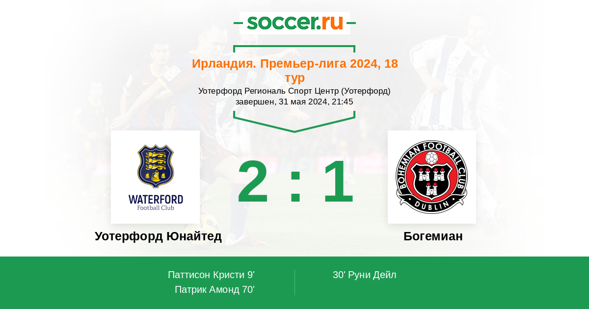 Ирландия. Премьер-лига 09.08.2024 Богемиан Логотип футбольный клуб Богемиан (Дублин) 2:3 Логотип футбольный клуб Уотерфорд Юнайтед Уотерфорд Юнайтед