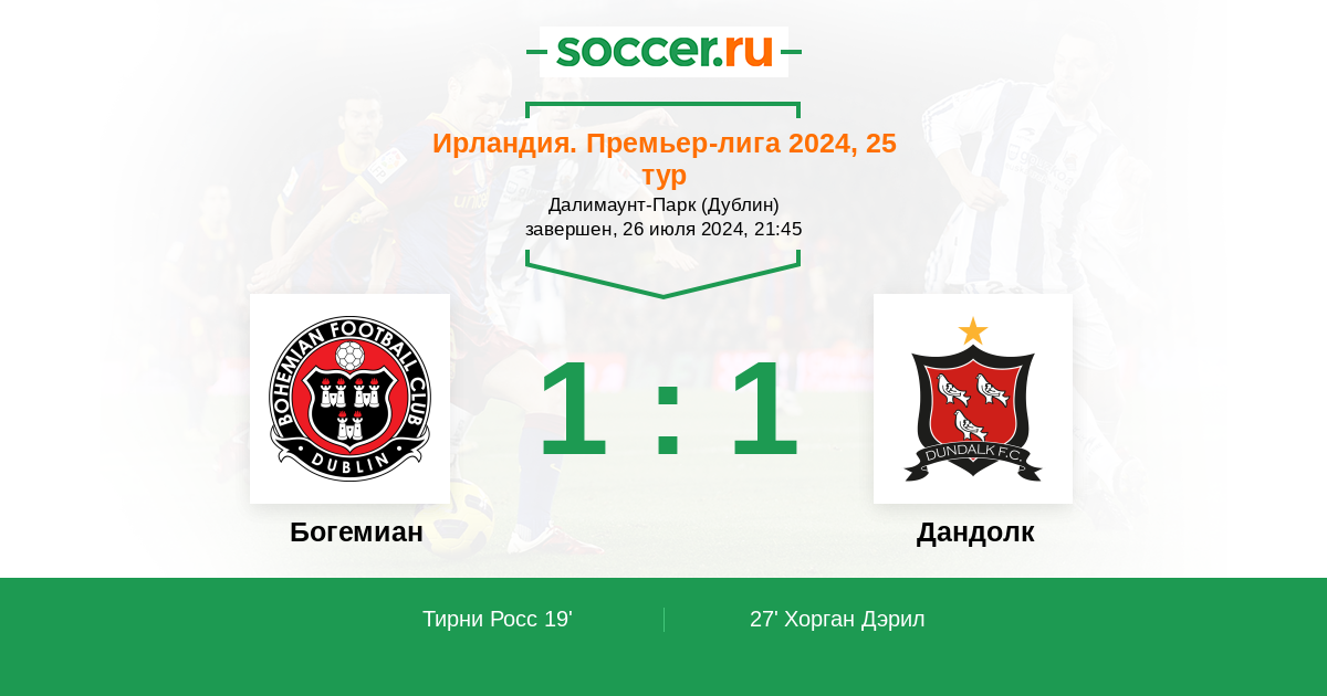 Ирландия. Премьер-лига 27.07.2012 Богемиан Логотип футбольный клуб Богемиан (Дублин) 2:1 Логотип футбольный клуб Дандолк Дандолк