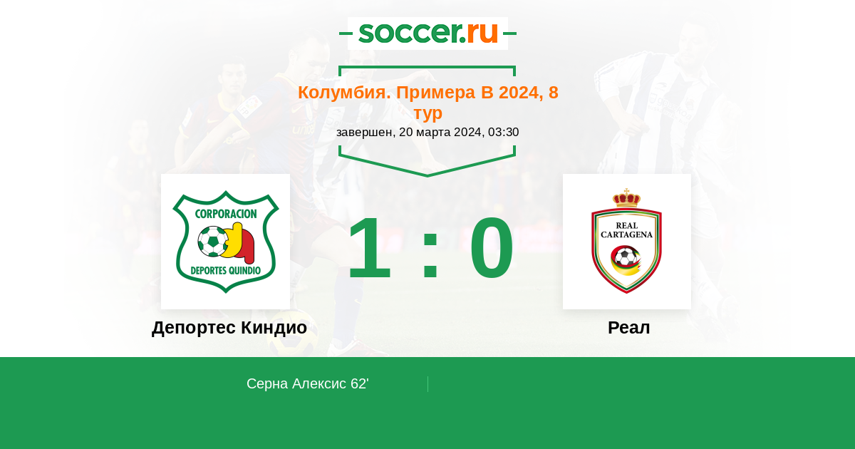 Колумбия. Примера B 03.09.2024 Реал Логотип футбольный клуб Реал (Картахена) 2:0 Логотип футбольный клуб Депортес Киндио (Армения) Депортес Киндио